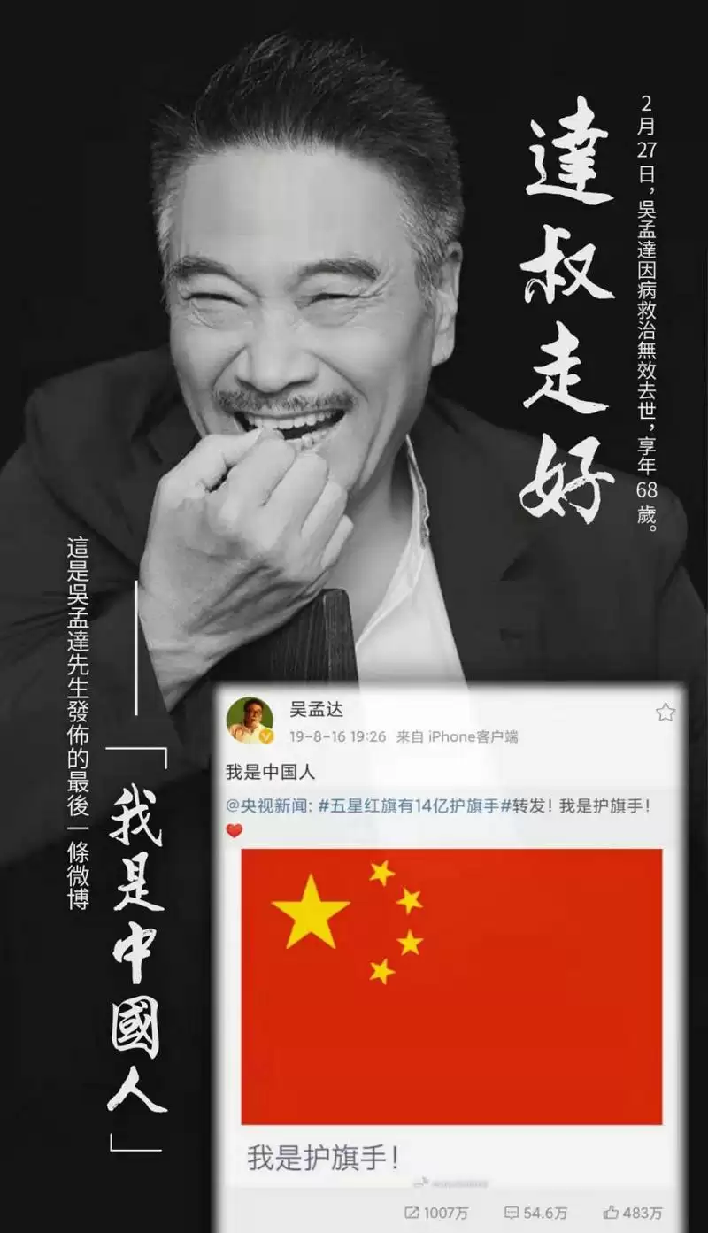 吴孟达的最后一条微博内容即由此而发,他就是14亿分之一的护旗手。