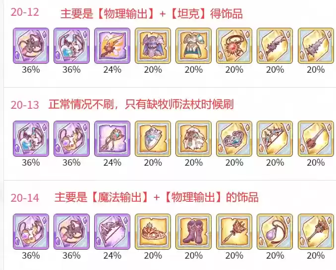 注:3月21图【衣服本】主要刷双掉落图【21-12】【21-13】【21-14】,那时候应该是N2,4月的22图【武器本】主刷【22-5】【22-6】【22-7】【22-8】。下2个月的地图主要刷双掉落,除了【20-12】掉落【物理饰品】之外,仅剩H图掉落,这次8天的6体推荐全刷20图饰品,增加物理饰品存量。