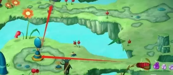 下到大鸟这里来,将刚才的瓶子放在蛇尾巴上,然后往下走,转动把手,使风扇塔的位置对着左下