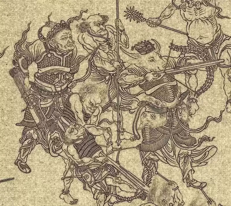 汉代画像砖图二,宋元《揭钵图》,牛头人射箭,身上甚至没有带箭囊。两个小鬼一个张弓,张弓身后之人在架箭。三人之后有弓手,符合宋军演练阵法在弩手之后布置弓手的习惯,见图三。全图还有类似带旗引阵军校之类的人物形象,可见画家是“有生活”的。