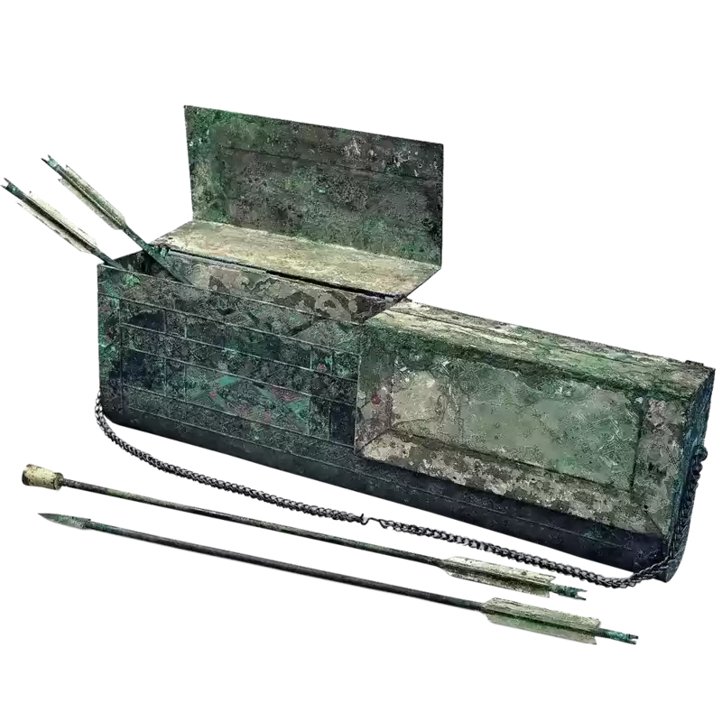 大家可以看看始皇陵连同铜车马一同出土的弩和弩箭冥器。确定是弩箭,因为是和弩一起出土的: