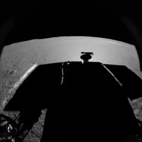 月昼上午“石笋”隐在车体的阴影中在烈日的炙烤中,玉兔度过了自己的春节,还没过初五,它就早早开启月昼下午的工作。驾驶员们控制着玉兔二号转弯至预定探测航向。按照此前地面规划路径推演,此时探测的道路一马平川,且“石笋”的高亮面应该能够进入红外视场内。然而,下传到地面的避障图像却充满艺术化的“明暗交替”,与科学家们希望的完全被阳光照射的“简单直白”不同。