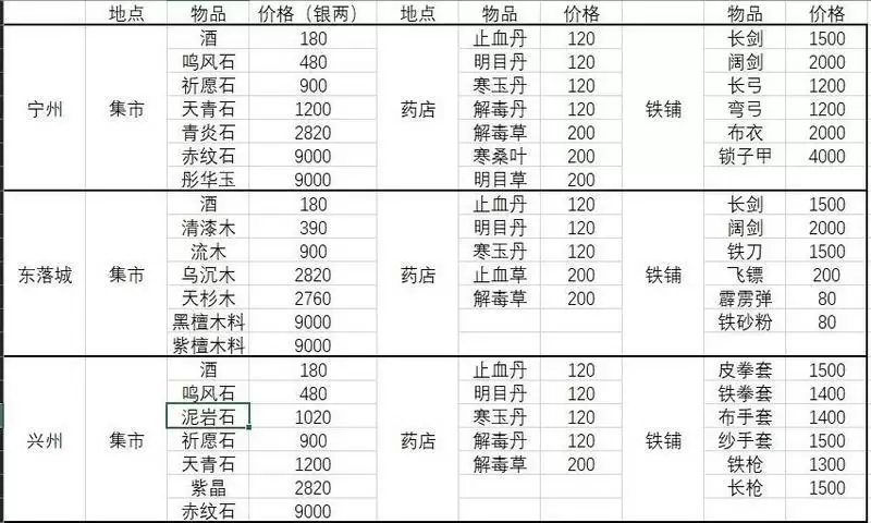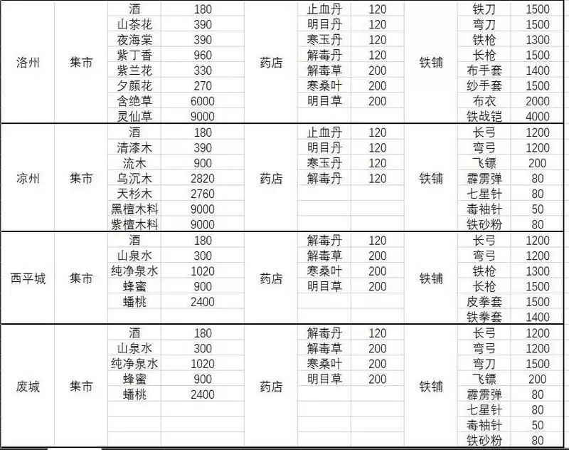 各城市集市药店铁铺出售物品介绍: