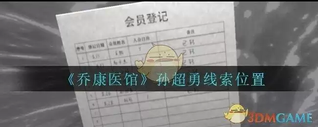 《乔康医馆》3级线索——孙超勇线索在哪里?乔康医馆是由孙美琪疑案开发团队开发制作的趣味解谜推理类游戏,游戏中我们这次将来到一家私人医院之中,在这里仔细的进行调查,发现背后的真相。下面是3DM手游网小编给大家带来的《乔康医馆》孙超勇线索位置介绍,还没有找到的小伙伴一起看看吧!