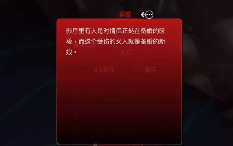 线索详情:影厅里有人是对情侣正处在备婚的阶段,而这个受伤的女人就是备婚的新娘。
