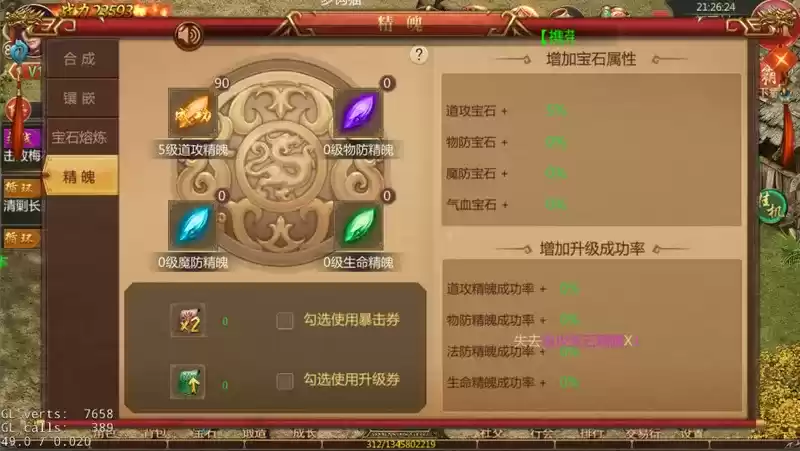 7. 宝石精魄等级上限等于玩家当前等级