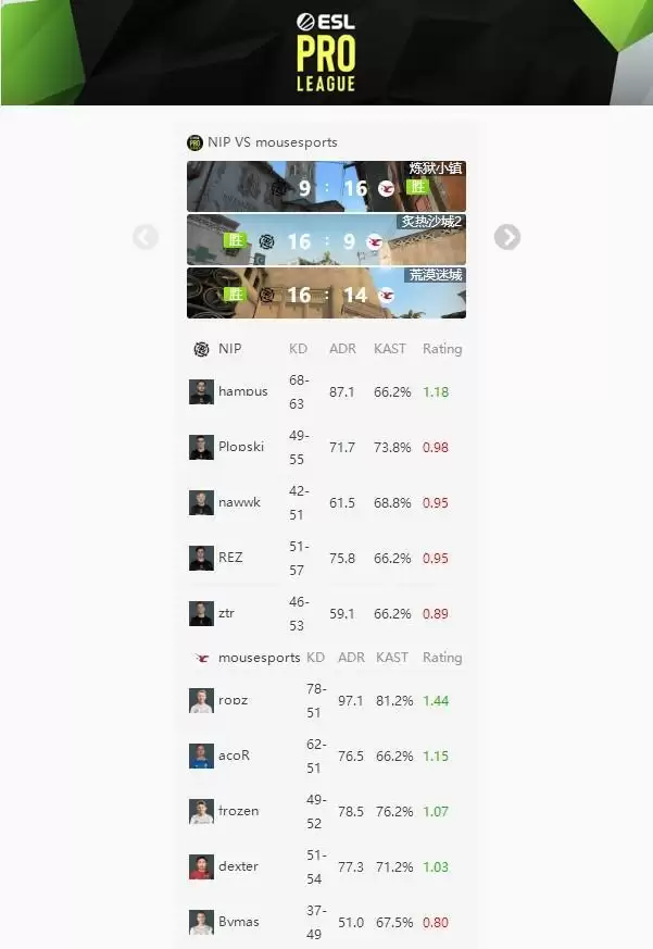 图一是NiP主动选择的Inferno,先做防守方的mouz在acoR手枪局精准的三杀收场之后就一直保持优势,ropz在A1顶住了NiP多次A点强攻。虽然在上半场中期NiP通过控图拿下了几分但是进入下半场后,手感火热的mousesports在进入长枪局之后就直接摧毁了NiP。图二来到mousesports自己选择的Dust2,先做进攻的他们总是出现掉队的情况,经常出现dexter冲在前面后面没人补枪的情况。hampus打得也十分鸡贼总是能够偷到首杀,纵使dexter打下102的ADR,acoR拥有最高的狙杀mousesports还是在图二告负。