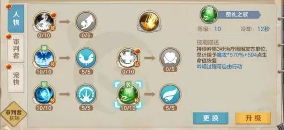 天使降临10/5,走审判路线的话,在各种技能加持后,天使拥有非常可观的DPS能力,天使不用在乎挂了,可以起到非常好的的消耗作用;圣光牢笼10/5,这是奶妈职业里唯一的硬控技能,不管是你走什么路线,这个肯定都要点满的;赞礼之歌10/5,范围治疗,奶量高,是走白贤者路线必备的,审判者路线也可选,我个人是尽量点满的。