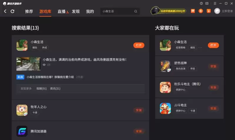 2、打开腾讯手游助手,在游戏库中搜索小森生活,下载安装小森生活;