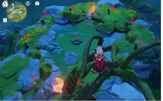 最高处之后能看到一堆石像,这个石像也不陌生,之前就做过这样的一个任务。按照图中1-2-4-7的顺序依次点亮247依次点亮,水池中间就会跳出个并且宝箱来,这是第一个碎片。