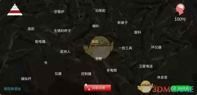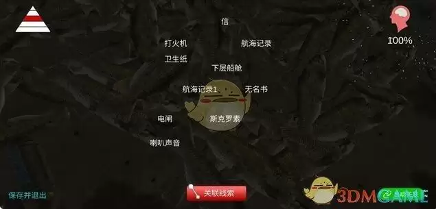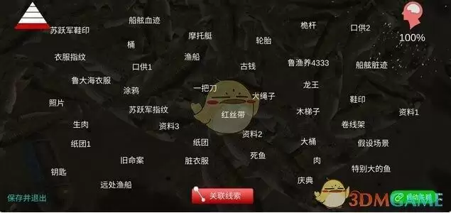 一级线索真相二级线索钥匙无字竹简苏跃军说谎吃人鲁大海去向三级线索信打火机卫生纸无名书航海记录航海记录1下层船舱斯克罗素电闸喇叭声音四级线索空香炉旧尾舵一些工具废料生锈的杯子坏仪器书其他人操纵杆卫星电话仪器控制器尾舵配电箱手电筒海闑喇叭新被子休息室渔获五级线索远处渔船摩托艇资料1资料2资料3桶大绳子桅杆纸团生肉人肉一把刀苏跃军指纹鞋印苏跃军鞋印古钱照片渔船船舷脏迹船舷血迹龙王轮胎死鱼木梯子卷线架大桶带血的衣服鲁大海衣服衣服指纹纸团1鲁渔养4333旧命案红丝带庆典钥匙特别大的鱼假设场景口供1口供2线索全图