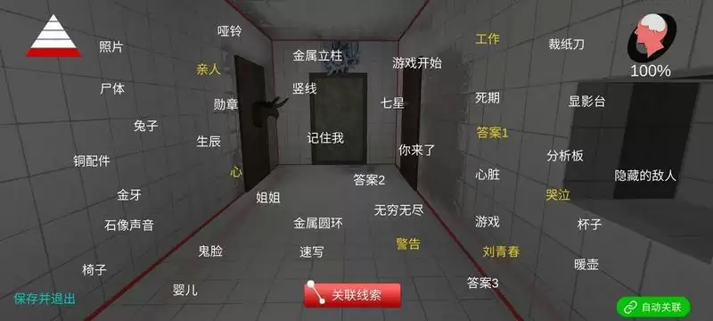 一级线索真相二级线索方向亲情恐惧榜样无奈三级线索恐龙皮球靶子小熊海豚玩具地图摩天轮碰碰车洪千祖假象四级线索线索离开眼睛灵魂提示1/5牛头牛的反刍提示2/5生提示3/5死门神1/2门神2/2怪胎1/3怪胎2/3怪胎3/3提示4/5提示5/5归还人性五级线索金属立柱游戏开始竖线姐姐金属圆环七星记住我你来了无穷无尽隐藏的敌人金牙石像声音铜配件警告工作生辰亲人死期心脏游戏哭泣婴儿鬼脸答案1答案2答案3人心刘青春显影台分析板杯子速写勋章照片哑铃裁纸刀尸体兔子椅子暖壶线索全图