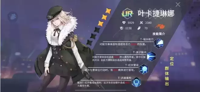 叶卡捷琳娜:唯一的UR,核心技能是【红色警戒】,敌方角色行动前,叶卡先朝他开一炮,且这一炮有额外火属性伤害加成。红色警戒满级后触发概率达到50%。但是目前叶卡并不常见,暂不多加赘述。