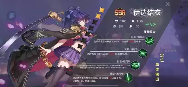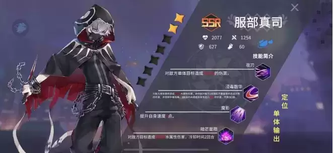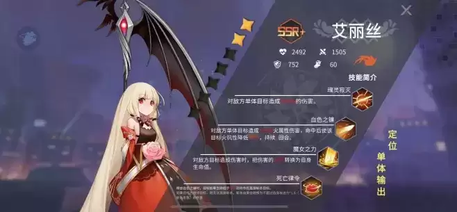 这个角色是个输出位,但是无法作为核心输出使用,最大的特色是6星技能6级后可以对目标死亡宣告,直接秒杀目标,但是boss无效,其他没有太大特色