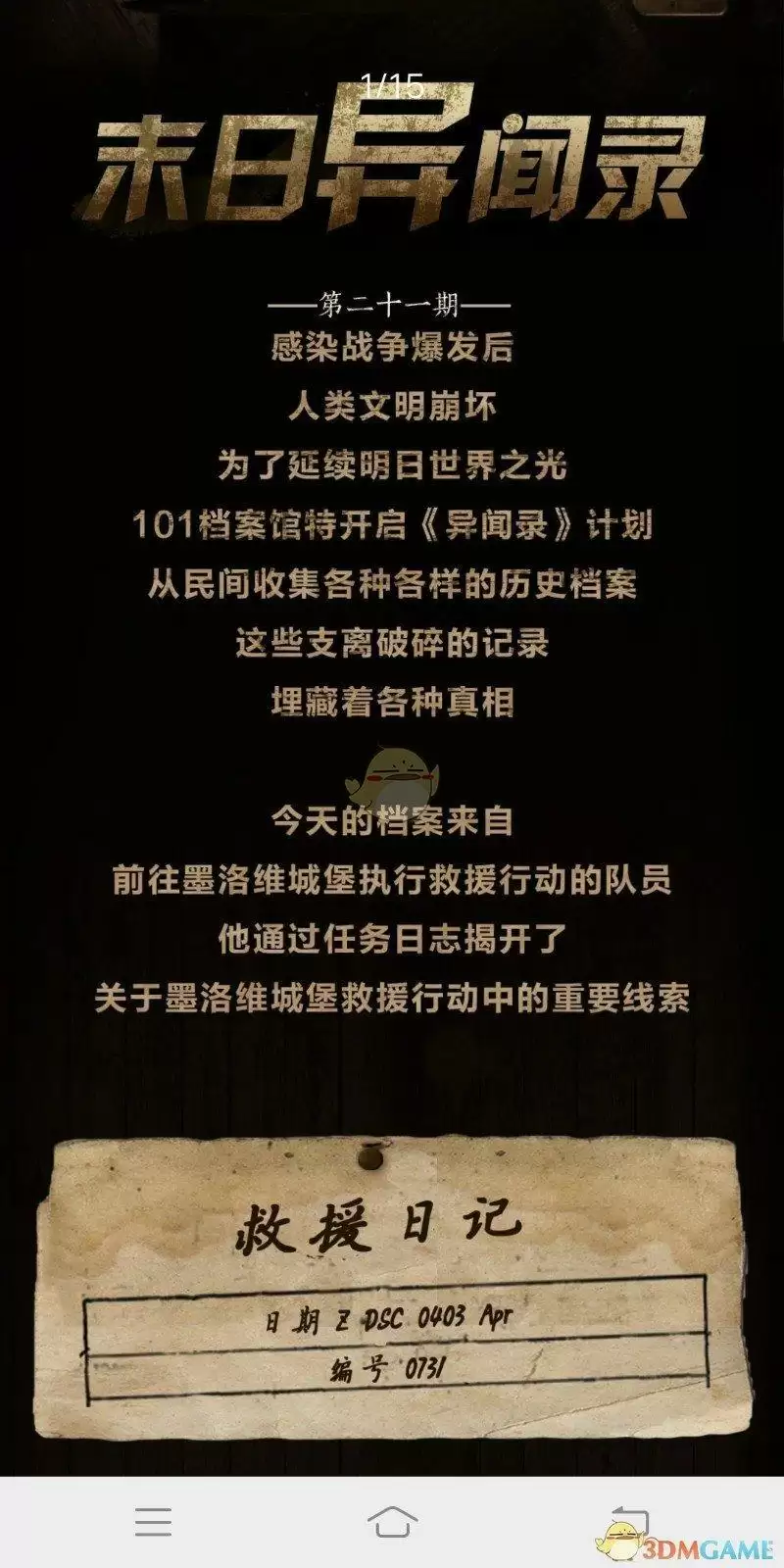 《末日异闻录》第二十一期的档案来自于前往墨洛维城堡执行救援行动的队员,他通过任务日志揭开了关于墨洛维城堡救援行动中的重要线索,本期异闻录共有两个题目,分别是【在卧室中搜救员捡到了什么东西?】、【密室的宝箱里装着什么?】两个问题答案是什么呢?一起看看《明日之后》末世异闻录21期答案吧!