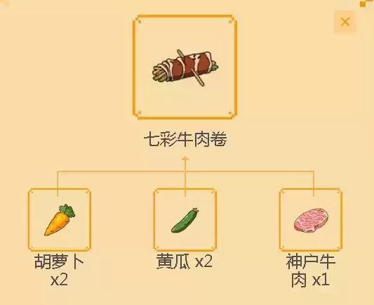 在游戏里边,七彩牛肉卷是一道可口的主食,其实需要的材料也没那么复杂,只要玩家准备两根胡萝卜、两根黄瓜、和一个神户牛排就可以啦。