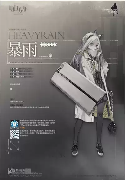 暴雨的防御力提升,生命上限提升,使自身和周围4格的友方干员获得迷彩