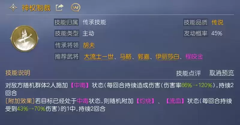 另外太阳神能够在敌人任一人处于【灼烧】的情况下,给敌方全体施加【灼烧】状态,扩大debuff的范围。同时,因为【灼烧】在此队伍中出现的概率相对较高,我们在给这三个将领搭配技能的时候也可以选择适配【灼烧】的技能,具体搭配推荐如图所示。
