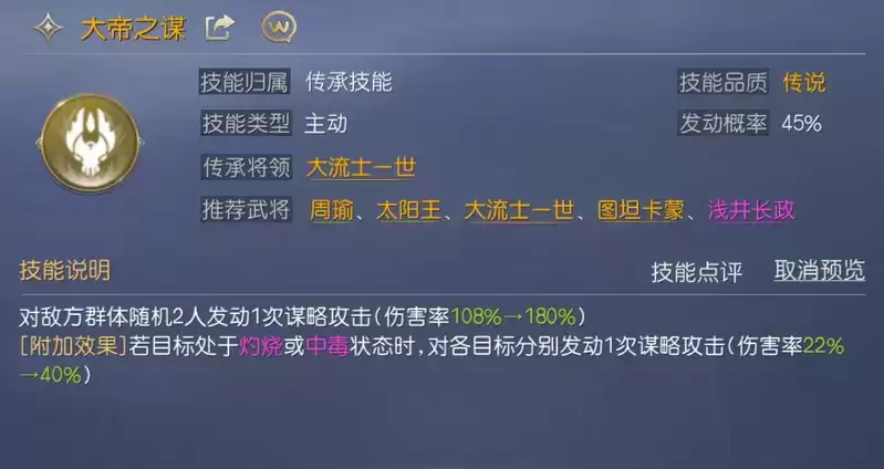 这两个技能都能对处于负面状态的敌人进行额外攻击或是额外状态施加,技能的自我联动性非常优秀,十分适合图坦卡蒙携带,另外平价四星技能也可以携带【耿谋】和【慷慨善战】这两个技能伤害都有不错的谋略加成,也有一定的控制效果,可以用来过渡。