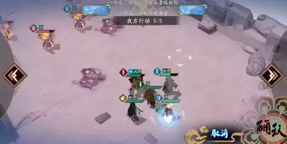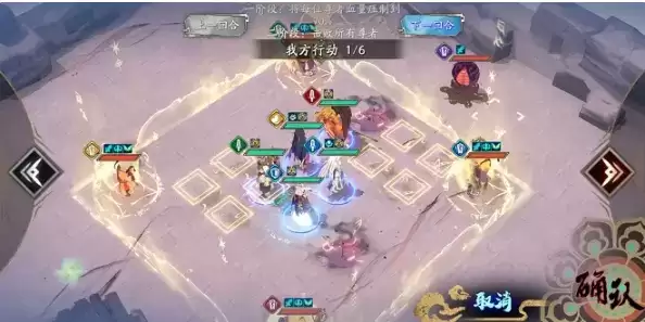 第5回合。冰璃对光咒师放幽剑,阴歙原地等待,白菀走到殷剑平右侧放神氛尉迟良对雷咒师放天机(反击后需要剩残血),殷剑平放日轮击杀雷咒师。敌动阶段,光咒师必定选择普攻尉迟良,阴歙抗住。