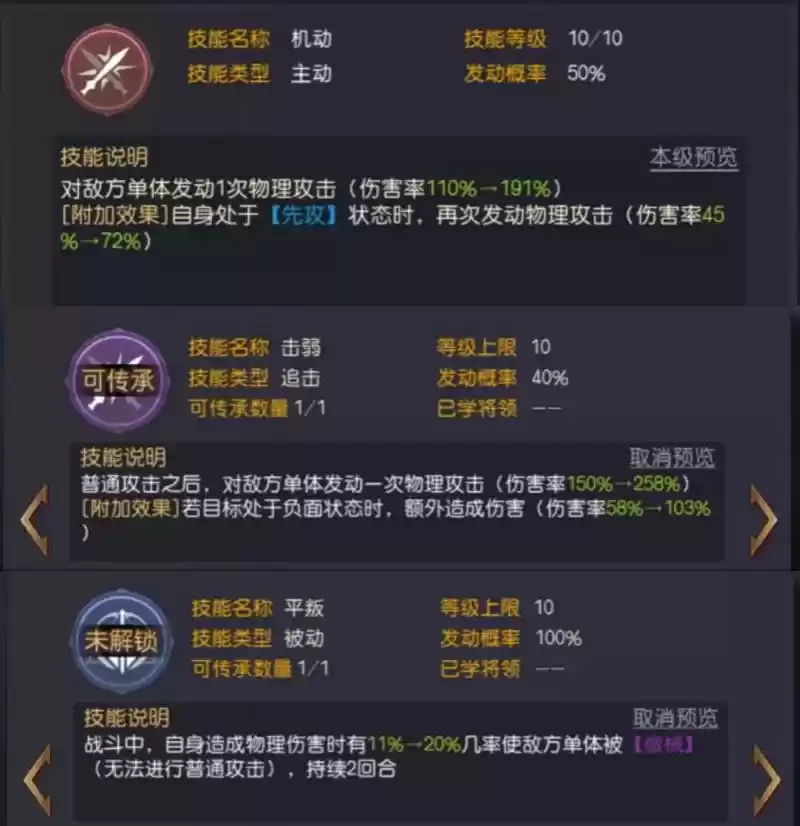 罗伯茨的三技能推荐学习【平叛】。技能效果为:战斗中,自身造成物理伤害时有11%-20%几率使敌方单体被【缴械】,持续2回合。因为罗伯茨的技能都为追击技能,可以打出多段物理伤害,这样使得更容易【缴械】敌方单体,限制他们的输出,且和【击弱】技能相契合,打出额外伤害。