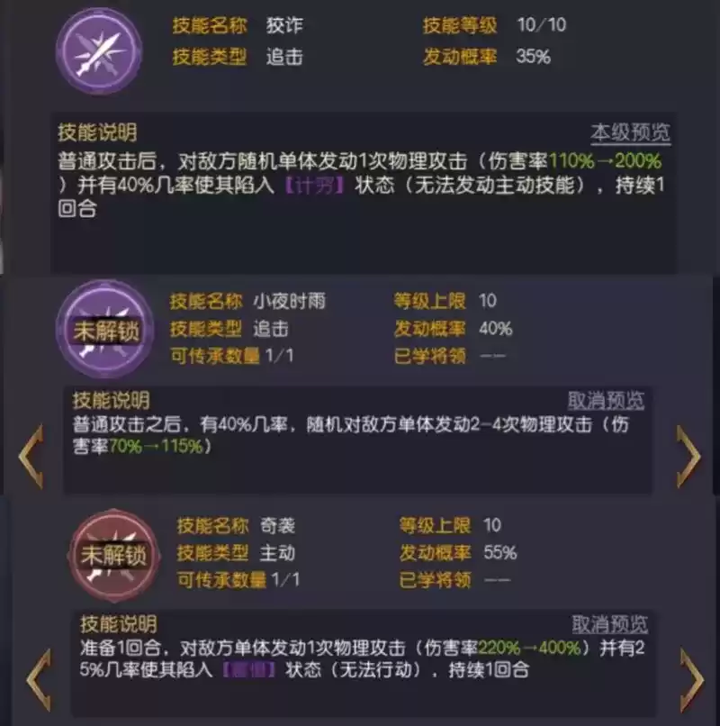 安妮波尼的自带技能为【狡诈】,技能效果为:普通攻击后,对敌方随机单体发动1次物理攻击伤害率为110%,满级为200%,并有40%的几率,使其陷入【计穷】状态。这是一个高伤害的单体技能,并且附带【计穷】,也就是沉默效果,使得对方无法发动主动战法,可以说大大削弱了敌方将领的输出。