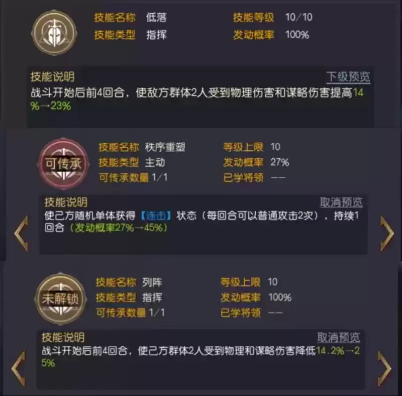亨利四世的三技能推荐使用【列阵】,技能效果为:战斗开始后前四回合,使己方群体2人受到的物理和谋略伤害降低14.2%,满级为25%。这个技能大大提升了阵容的坦度,使得前期受到的伤害减少了,提高了队伍的存活能力。