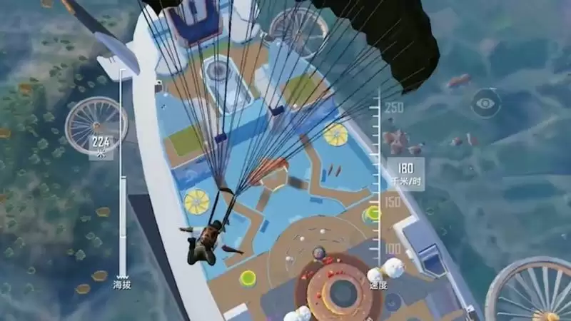 玩家从飞机上降落时,也会带着降落伞。在落到飞艇上之前,玩家可以在飞艇的上空看到整个飞艇的大致布局,便于后期在飞艇上进行更多的游戏。