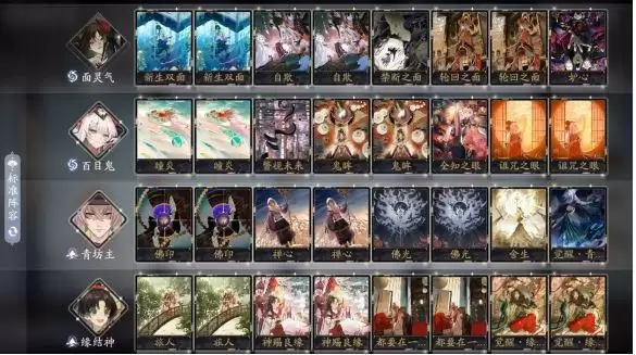 阵容名: 面灵气 妒心 (1) 新生双面 (2) 自欺 (2) 禁断之面 (1) 轮回之面 (2) 百目鬼 诅咒之眼 (2) 瞥视未来 (1) 瞳炎 (2) 鬼眸 (2) 全知之眼 (1) 青坊主 觉醒·青坊主 (1) 舍生 (1) 佛印 (2) 禅心 (2) 佛光 (2) 缘结神 觉醒·缘结神 (2) 旅人 (2) 神赐良缘 (2) 都要在一起 (2)