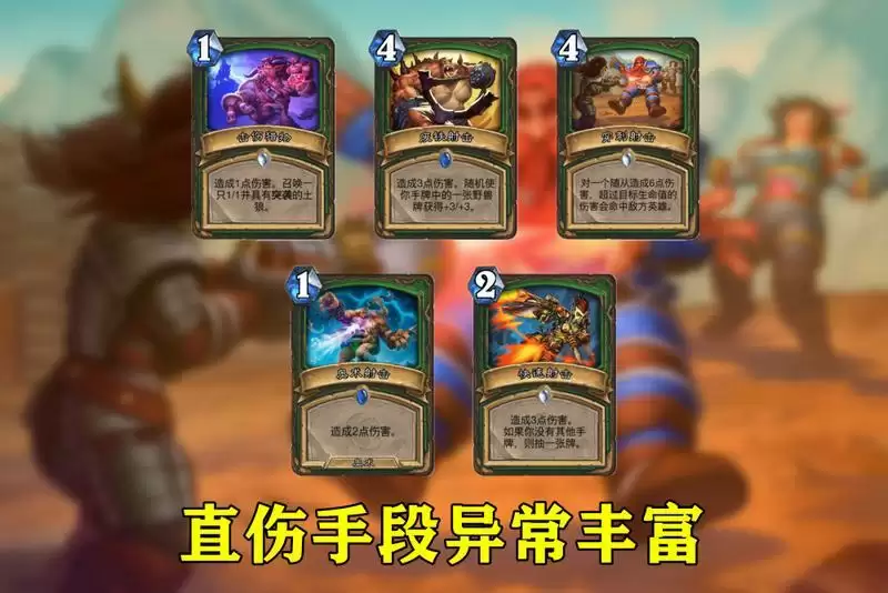 炉石传说狮鹫年的退环境虽然让猎人失去了大量快攻体系的卡牌,比如杀戮命令、支线任务等,但贫瘠之地新卡和核心系列又为猎人补充了一些直伤手段。新版本的T7猎手握击伤猎物、奥术射击、快速射击、废铁射击和穿刺射击一共5张直伤法术,可造成18到30点伤害。光是这些法术配合技能射箭,就足以拿下对手了,何况还有新生刺头、魔喉前期蹭血,中期小刀商贩和狂踏的犀牛直伤打脸呢?