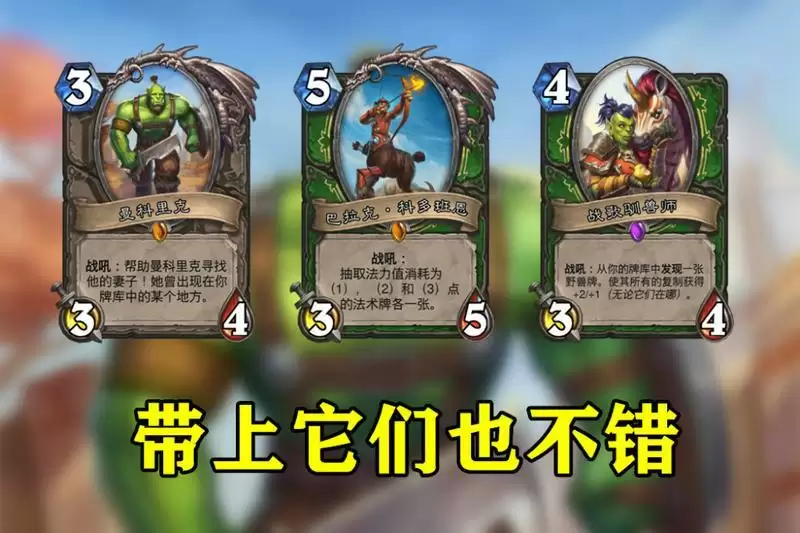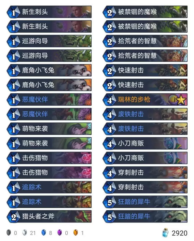 卡组中,瑞林的步枪、拾荒者的智慧、巡游向导、废铁射击都是可替换的卡牌,我们可以根据自己的需要减少它们的数量。空出的卡位,可以选择带上奥术射击和巴拉克在中期抽一波法术,带上曼科里克提供一个直伤和高质量随从,还可以带上看起来和T7猎不搭,实际效果却非常棒的战歌驯兽师,用它发现狂踏的犀牛可以提高穿刺伤害。带上这些卡牌,奥术之尘需求会大幅提高,你们根据自己的情况自行斟酌吧。