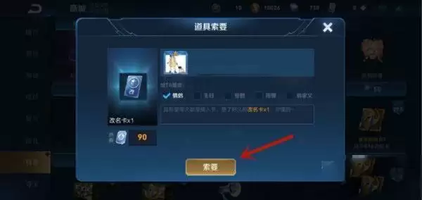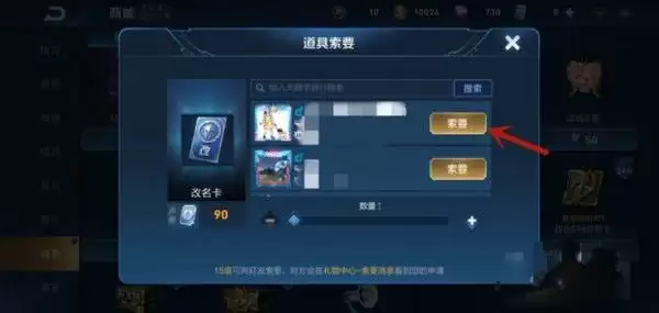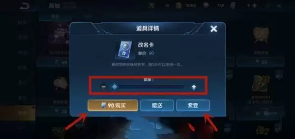 4、之后在弹出来的窗口,选择购买的数量,点击【90购买】,可以用90点击购买获得改名卡;还可以点击【索要】按钮,如图所示。