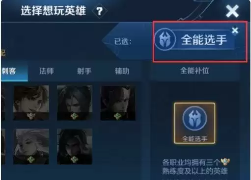 三、进入该窗口内就可以看到“全能补位”达成的称号,若该位置是已经有一个称号情况下(注意,必须是英雄主职业才行,如:一个英雄主职业是战士,同时还带有刺客的标签,那么达成蓝色后就只计算为战士),那么点击该称号。