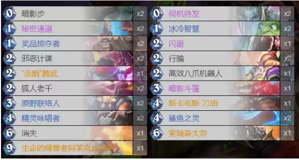 这几张牌是真的很好用,虽然说是key牌但是我们可以暗影步回手并且打出精灵咏唱者或0费的行骗。而且在套牌中的key牌都是随从而非法术,完全可以无视大部分奥秘,赛布这类天梯流行的节奏卡,精灵咏唱者也可以稳定抽到这些随从。