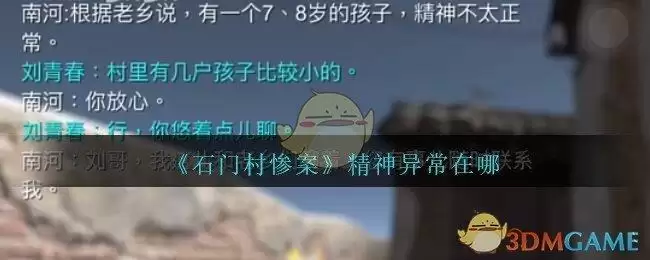 石门村惨案是《孙美琪疑案》第六季最后一集,本案中南河和刘青春汇合了,游戏中五级线索——精神异常在哪里呢?下面是3DM手游网小编给大家带来的《孙美琪疑案:石门村惨案》精神异常获得位置介绍,有需要的小伙伴一起看看吧!