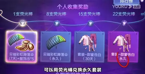22个荧光棒就可以免费兑换出套装甜蜜告白永久、海滨厨神、服饰币等丰富奖励。