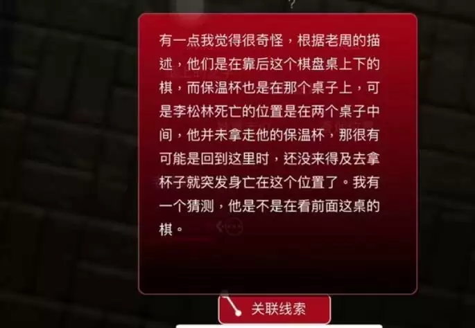 有一点我觉得很奇怪,根据老周的描述,他们是在靠后这个棋盘桌上下的棋,而保温杯也是在那个桌子上,可是李松林死亡的位置是在两个桌子中间,他并未拿走他的保温杯,那很有可能是回到这里时,还没来得及去拿杯子就突发身亡在这个位置了。我有一个猜测,他是不是在看前面这桌的棋。