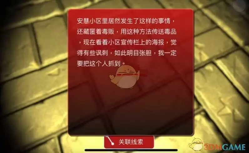 线索详情:安慧小区里居然发生了这样的事情,还藏匿着毒贩,用这种方法传送毒品,现在看着小区宣传栏上的海报,觉得有些讽刺,如此明目张胆,我一-定要把这个人抓到。