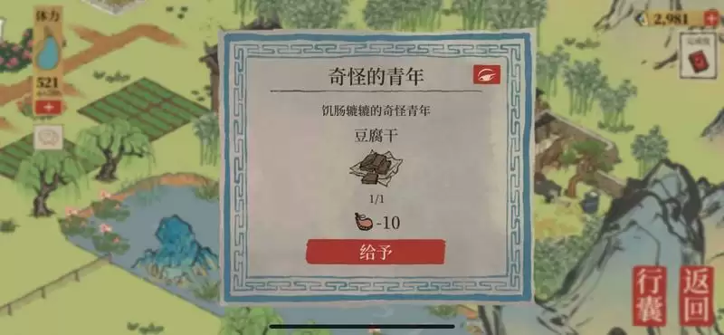 在右上角多了一块迷雾,点击迷雾前的牌坊,然后进入,在第三个房子兑换豆腐干,然后将豆腐干交给奇怪的青年,这些就是目前新增的任务,后面的任务还没更新,需要等到下次活动了。