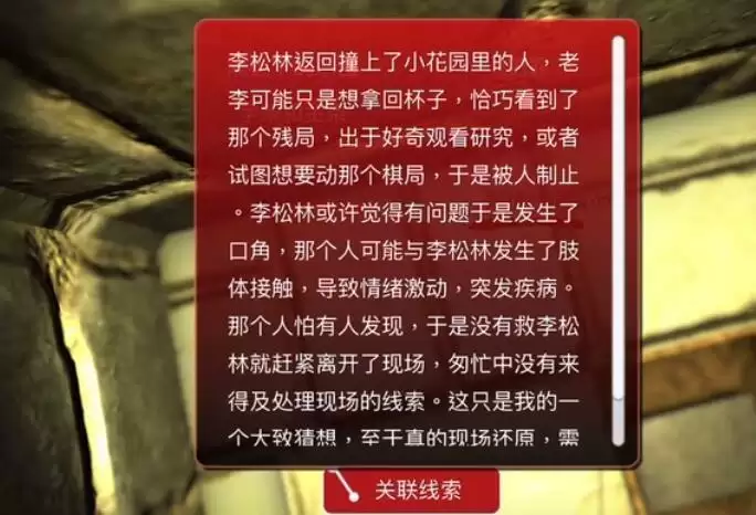 李松林返回撞上了小花园里的人,老李可能只是想拿回杯子,恰巧看到了那个残局,出于好奇观看研究,或者试图想要动那个棋局,于是被人制止。李松林或许觉得有问题于是发生了口角,那个人可能与李松林发生了肢体接触,导致情绪激动,突发疾病。那个人怕有人发现,于是没有救李松林就赶紧离开了现场,匆忙中没有来得及处理现场的线索。这只是我的一个大致猜想,至于真的现场还原,需要赶紧找到那个人。