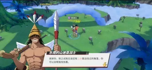 我们从码头这个位置往中心走去,在这里会有一个NPC“乐观的山迪亚战士”,而在它的前面会有一个探索区域。探索可以获取特殊物品,这在后面会使用到。