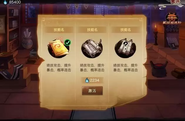 天书残卷在玩家通过指定关卡后可升级为藏经阁,提升主角属性以及学习更多技能。