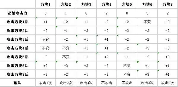 依次攻击七个方块1、2、3、0、0、3、2次,使所有方块的攻击力变为4,按动技能即可过关。