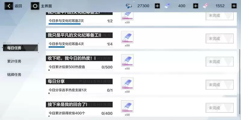 在纪典手札—每日任务中,会发布今日累积投票热度、今日活跃度或今日分享次数等任务,完成每个任务都可获得50纪典印花。
