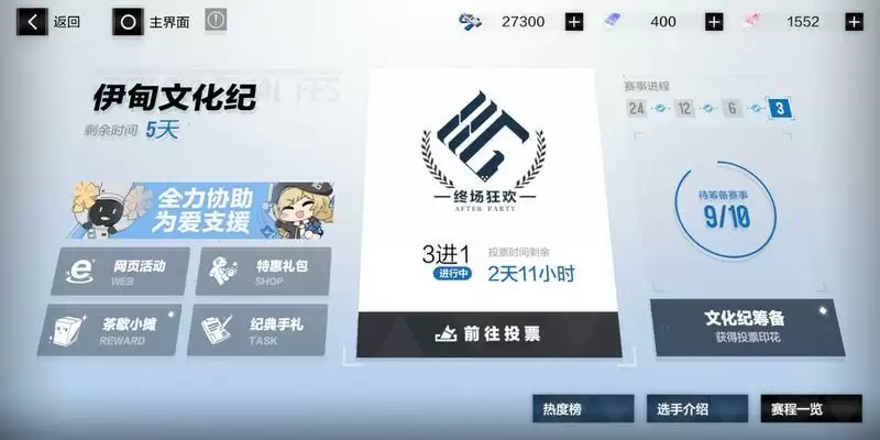 在伊甸文化纪活动界面,点击前往投票,即可花费纪典印花来等比增加角色热度值,当热度值达到特定阶段还能获得该角色的专属铭牌哦~同时,用于投票的纪典印花还会等比转换为欢愉,欢愉可在茶歇小摊抽取盲盒,且无累积上限。