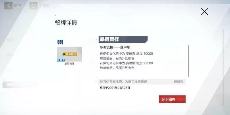 初始获得的铭牌仅为最低品质,以暴雨舞伴铭牌为例,要想升级铭牌,玩家必须在文化纪活动中继续给赛琳娜投票,达到1万点热度值时铭牌将升为银色;达到2.25万热度值将升到金色。