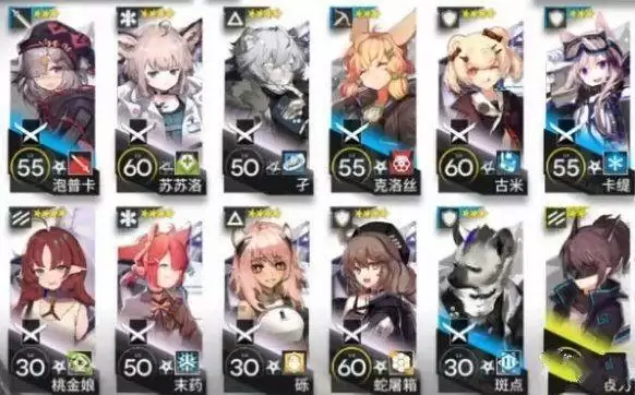 向日葵先锋(桃金娘);群攻近卫(泡普卡);单体治疗x2(苏苏洛、末药);自闭近卫/特种(孑);快速复活(砾);单体狙击(克洛丝);重装x4(古米、卡缇、斑点、蛇屠箱);替补(夜刀)