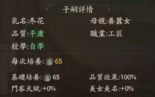 子嗣的资质取决于母亲,像养蚕女的孩子冬花,品质平庸,而且职业是工匠,因此如果想要品质比较高的孩子,那么就要迎娶品质高的美女为妻,这样生下的孩子先天品质就会高。