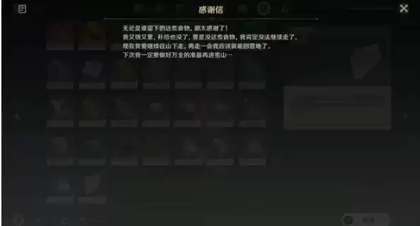 做完应急补给任务后,如果第二天再去补给点的话可以找到一个道具【感谢信】,是来自于想要进入雪山的冒险家的,算是一个彩蛋吧。