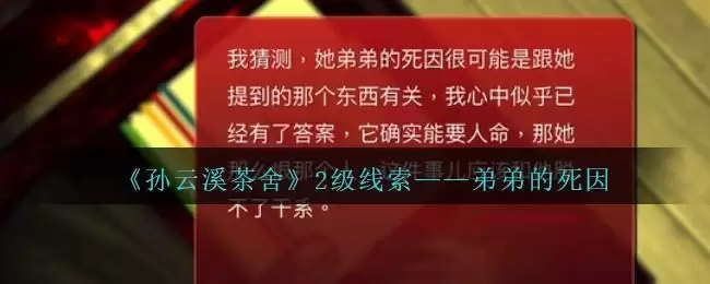云溪茶舍DLC是孙美琪疑案百家姓系列游戏之一,游戏中2级线索——弟弟的死因在哪里呢?下面是3DM手游网小编给大家带来的《孙美琪疑案:云溪茶舍》弟弟的死因线索获取位置介绍,还没有找到线索的小伙伴一起看看吧!